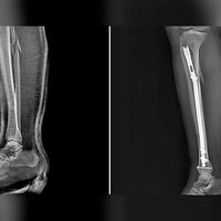 Пациентке диагностировали оскольчатый перелом костей голени, большой берцовой и малой берцовой костей. Травматологи под анестезией осуществили сращивание костей, закрепив их штифтом и винтами.