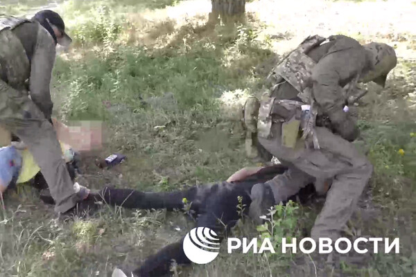Сотрудники ФСБ валят мужчину и женщину на землю, после чего надевают на них наручники. На камеру россиянин рассказал, что пришел на место, чтобы забрать посылку. По его словам, ранее с ним связался человек, представившийся сотрудником главного управления разведки министерства обороны Украины.
