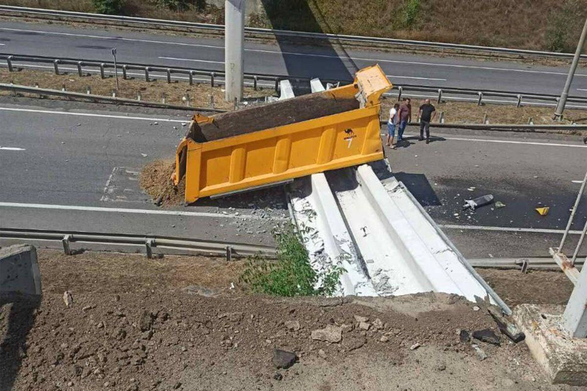 Журналисты рассказали, что инцидент произошел на трассе Киев — Одесса. Один из пешеходных мостов, висящих над автомобильной дорогой, упал прямо на находившийся под ним грузовик.