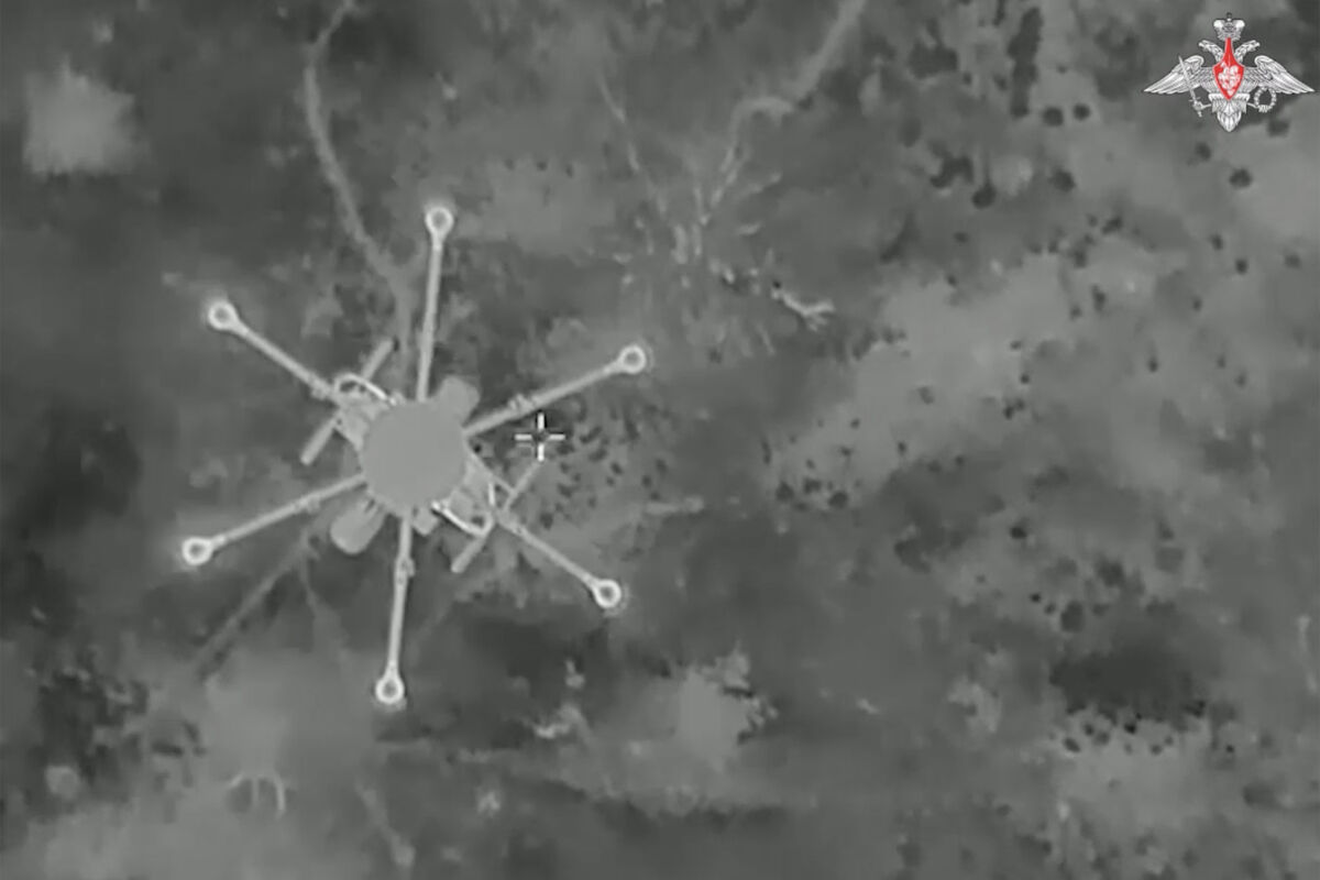 Минобороны РФ опубликовало в Telegram-канале кадры из Курской области, на которых российские военные обезвреживают беспилотник «Баба-яга» ВСУ, сбросив на него сеть.