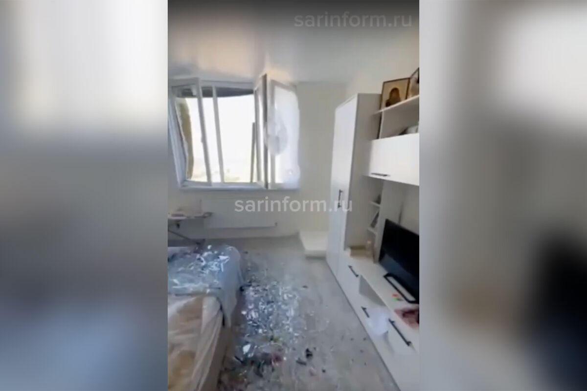 В результате атаки беспилотника в городе Энгельсе Саратовской области в многоэтажном доме были выбиты стекла. Видео разбитой квартиры sarinform.ru прислал очевидец.