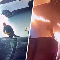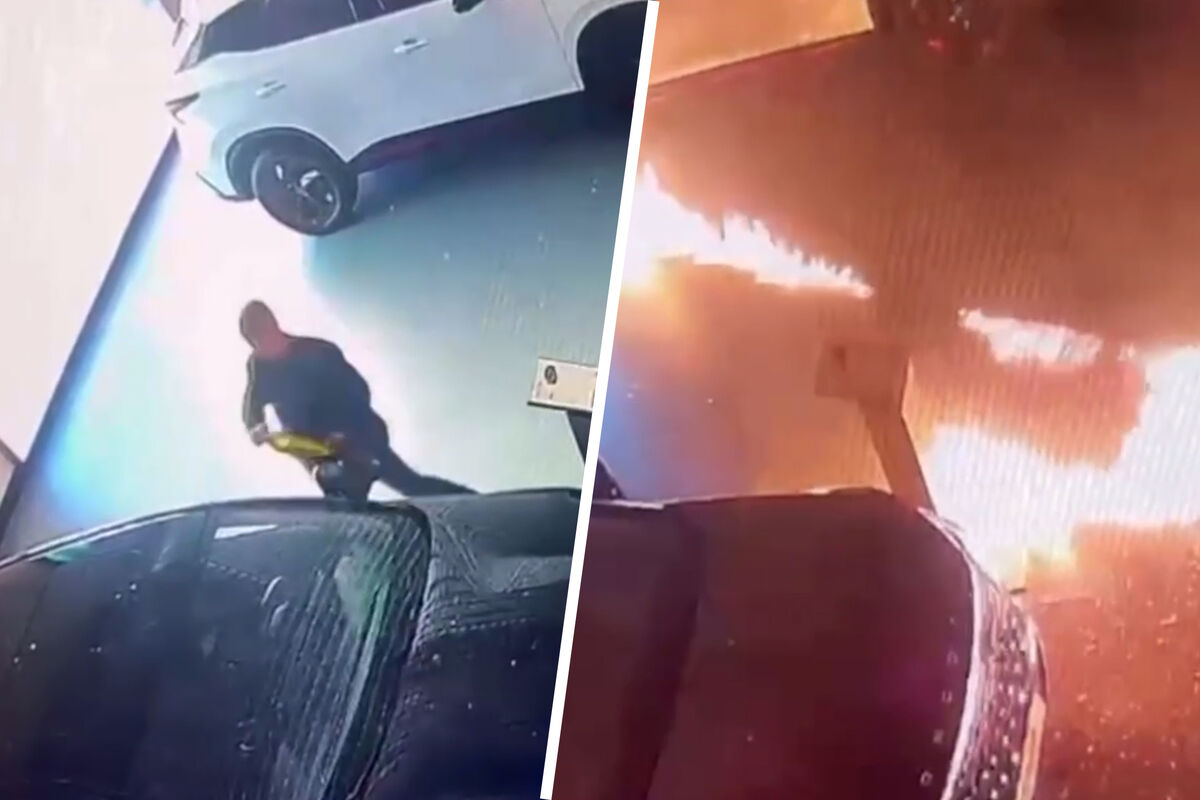 На кадрах ролика, опубликованного правоохранителями, поджигатель разбил окно в салоне, залил помещение горючей жидкостью и поджег, после чего скрылся. Огнем повреждены два автомобиля.