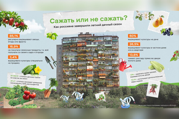 Россияне предпочитают разные форматы для посадок: 60% опрошенных выращивают культуры на даче, 26,5% — у себя в частном доме или в квартире, а 13,8% сажают прямо во дворе жилого дома. При этом никто из опрошенных не выбрал вариант аренды грядок.