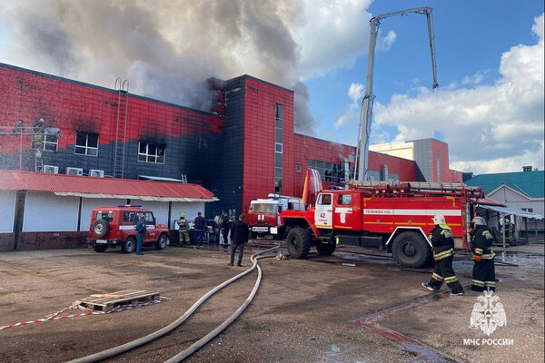 «На данный момент пожар удалось локализовать на площади 2 500 квадратных метров, произошло частичное обрушение кровли на 1 200 квадратных метрах», — сообщили в пресс-службе министерства.