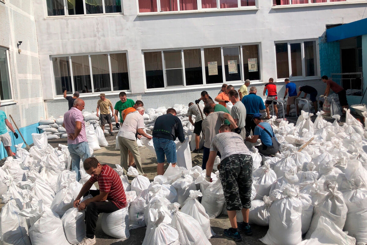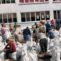 На странице гимназии в соцсети появились фотографии, как родители учащихся и педагоги в свободное от работы время укрепляют здания бетонными блоками и мешками с песком.