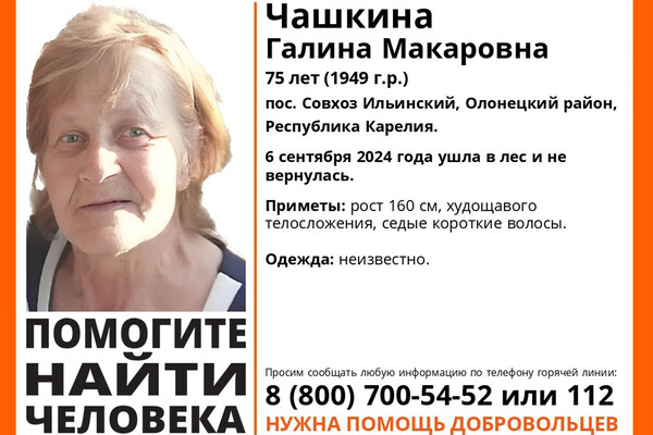 75-летняя пенсионерка ушла в лес в Олонецком районе 6 сентября вблизи поселка Совхоз Ильинский, и домой не вернулась. К поискам женщины привлечены волонтеры центра «ЛизаАлерт».