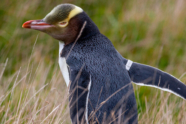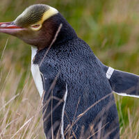 Находящийся под угрозой исчезновения желтоглазый пингвин, или хойхо, является крупнейшим видом пингвинов материковой части Новой Зеландии и отличается бледно-желтой полосой перьев у глаз.