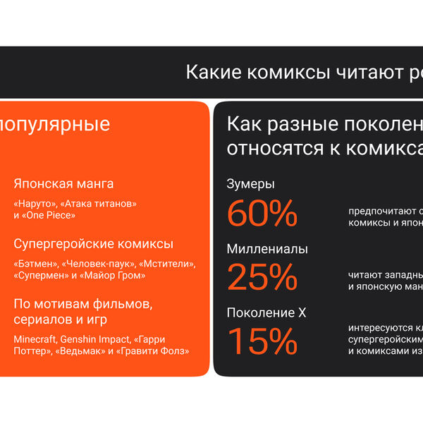 По данным исследования, самым популярным жанром комиксов среди россиян стала японская манга. Например, «Наруто», «Атака титанов» и «One Piece». На втором месте — супергеройские комиксы студий Marvel и DC («Бэтмен», «Человек-паук», «Мстители» и «Супермен»), а также отечественный «Майор Гром» от Bubble. На третьем месте — комиксы по мотивам фильмов, сериалов и видеоигр — Minecraft, Genshin Impact, «Гарри Поттер», «Ведьмак» и «Гравити Фолз».