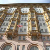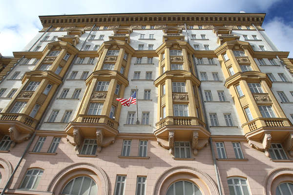 В Москве на фасаде посольства США появилось послание – RT опубликовал свой логотип с надписью «Мы не уйдем» на русском и английском языках.