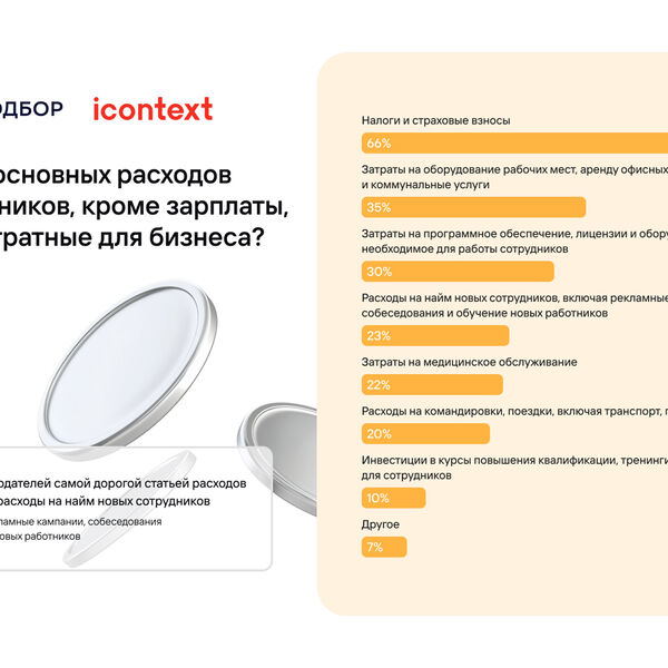 Основную долю расходов для работодателей составляют налоги и страховые взносы (66%). Около трети (35%) называют самой затратной категорией траты на оборудование рабочих мест, аренду офисов и коммунальные услуги. Это показало исследование сервиса СберПодбор, сети «Пятeрочка» и маркетингового агентства icontext, с результатами которого ознакомилась «Газета.Ru».