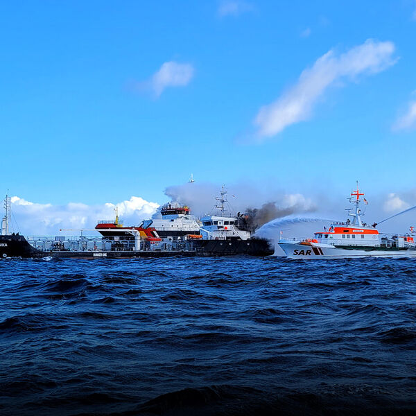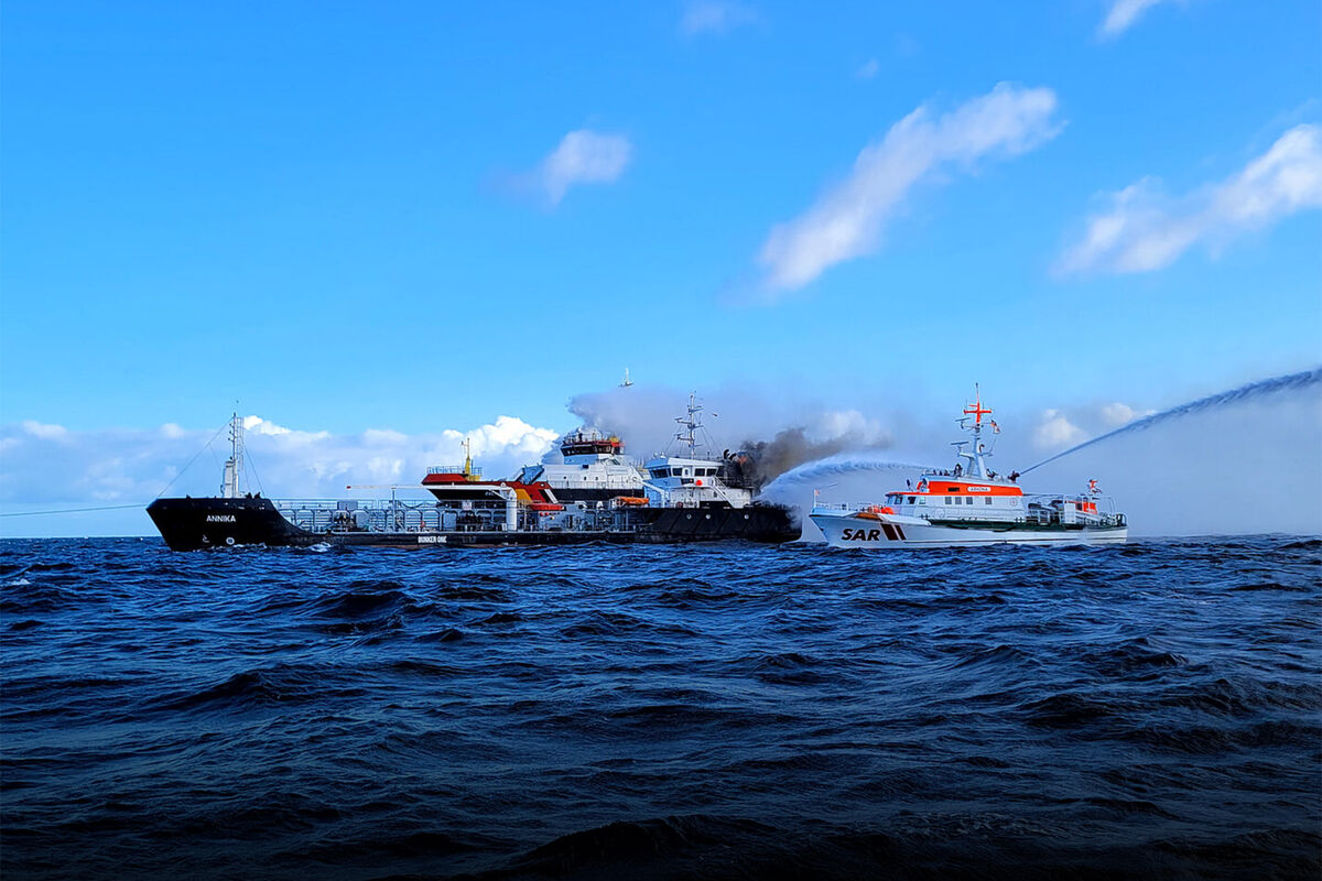 Аварийно-спасательный крейсер «АРКОНА» со станции DGZRS в Варнемюнде, глубоководный спасательный буксир «Балтика», зафрахтованный Федеральным министерством транспорта, и многоцелевое судно «Аркона» приступили к действиям по тушению пожара. На пути еще много транспортных средств и несколько вертолетов.