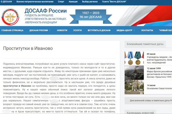С официального сайта Добровольного общества содействия армии, авиации и флота (ДОСААФ) России пропала статья, рекламирующая услуги проституток, заметил корреспондент Газеты.Ru.