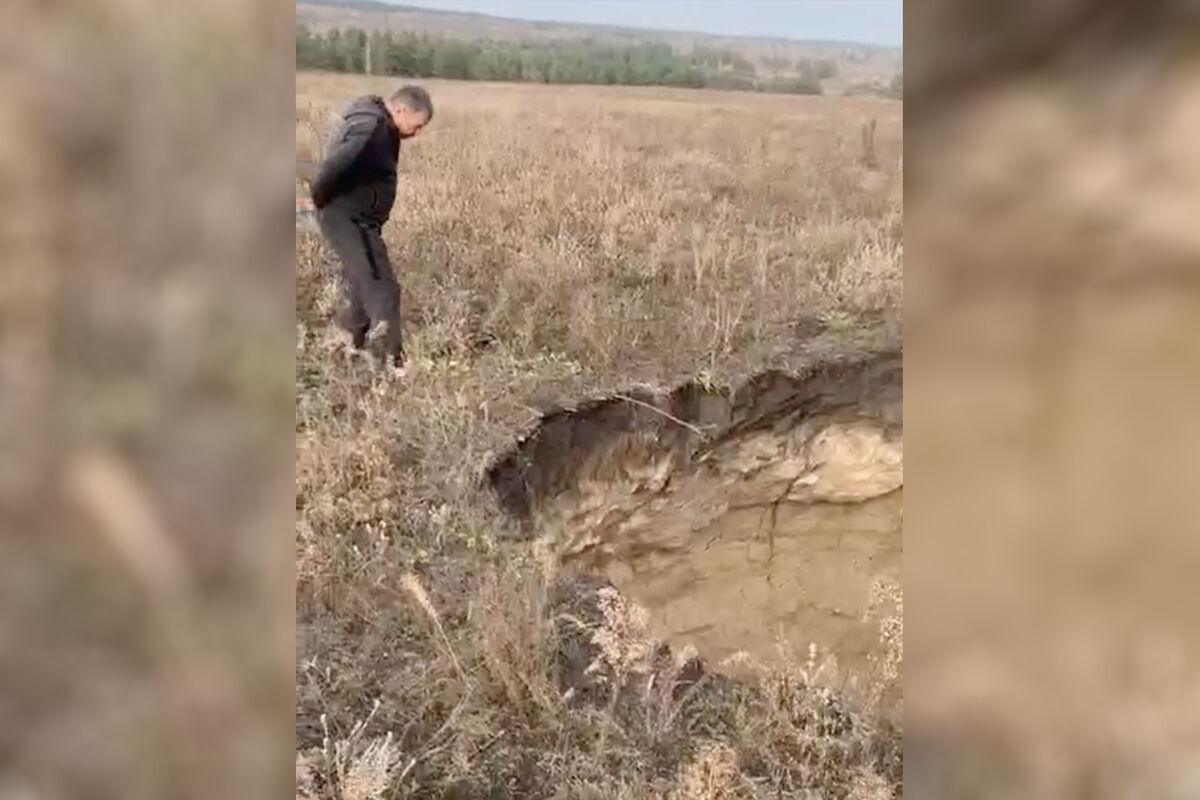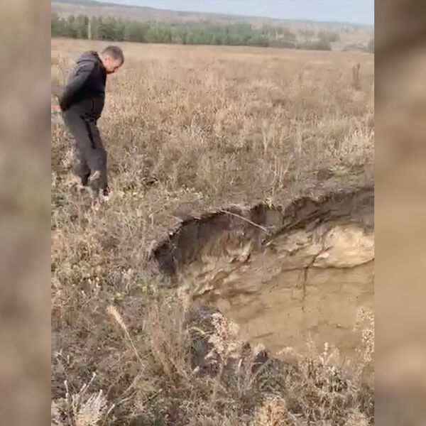 На записи запечатлен мужчина, который осторожно и с опаской подходит к глубокой яме, образовавшейся посреди поля. После этого камера показывает сам провал, в котором не видно дна.