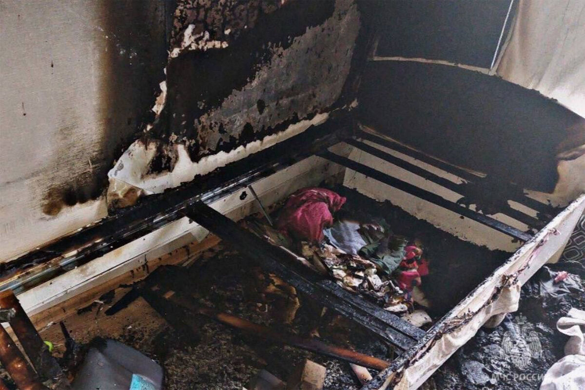 В момент возгорания квартира была пуста, никто не пострадал. На кадрах с места инцидента видно выгоревшую часть комнаты.