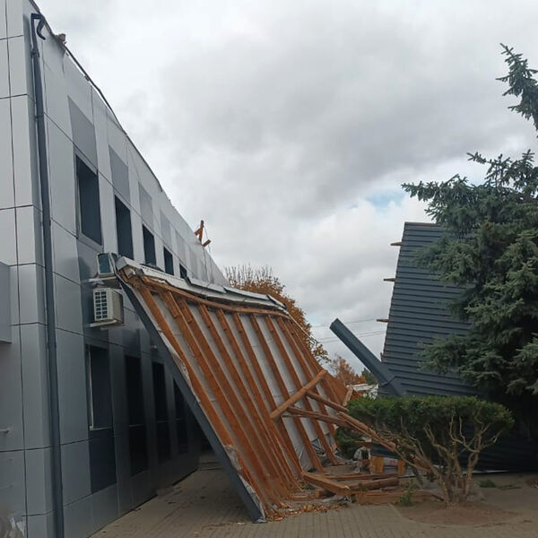 «Сильным порывом ветра повреждена металлическая кровля административного двухэтажного здания Торгового дома МТЗ-Северо–Запад на площади 420 кв. м», — говорится в сообщении.
