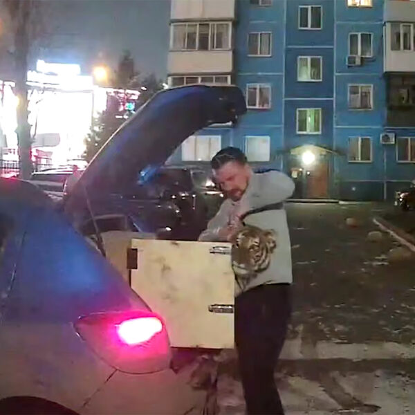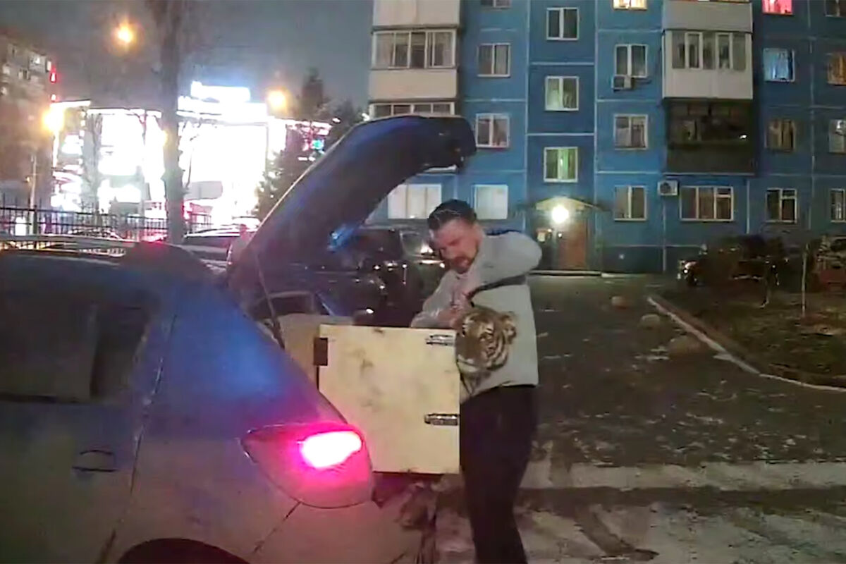 В Новосибирске мужчина привез на машине тигренка и отвел его в квартиру. Это попало на придомовую камеру видеонаблюдения. Позже видео разместил Telegram-канал АСТ-54 Black.