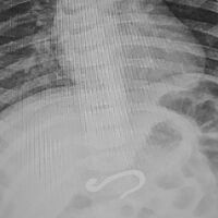 Восьмимесячный мальчик поступил на днях в экстренный приемный покой ЧОДКБ с подозрением на проглоченный колпачок от ручки. Однако рентген показал, что в его желудке находится металлический крюк внушительных размеров, который уже частично погрузился в двенадцатиперстную кишку.