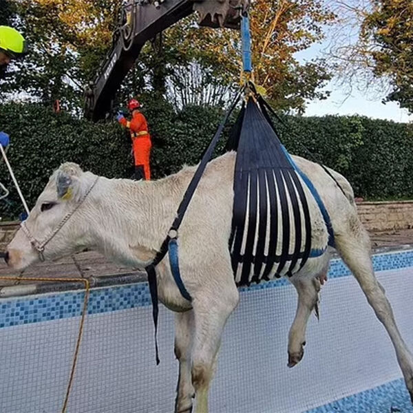 С помощью специальной упряжки и крана 590-килограммовую корову достали из бассейна. Несмотря на незначительный порез на передней ноге, ветеринар оценил ее состояние как «здоровое и хорошее».