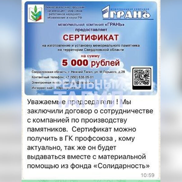 «Мы самая крупная профсоюзная организация образования в Свердловской области, у нас 6 тысяч членов. Мы не промышленное предприятие, у которого есть прибыль. Для того, чтобы проводить интересную работу, конкурсы профессионального мастерства, чтобы оказывать материальную помощь, у нас средства ограничены. Поэтому мы многие годы сотрудничаем с огромным количеством учреждений, заключая с ними договоры о социальном партнерстве. Они используют наш информационный ресурс и предоставляют членам профсоюза услуги по льготным ценам. К нам пришел молодой человек с предложением о том, что готов предоставлять скидки [на надгробия], подготовил сертификаты. И тем, кто похоронил родных и близких, — пожалуйста, будет оказана такая помощь, если они обратятся в его организацию. Лежит этот сертификат: хочешь — возьми, не хочешь — не бери. Почему не поддержать людей?» — объяснила Кузнецова.