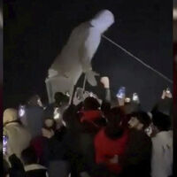 На видео видно, как несколько человек под одобрительные возгласы толпы тянут веревку, привязанную к белому памятнику, пока тот не свалился.