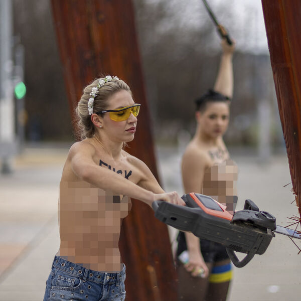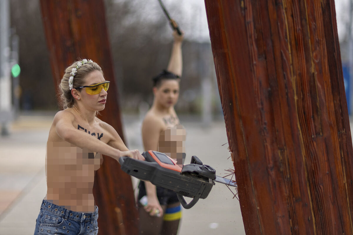 Полуобнаженные украинки повредили бензопилой памятник у здания ООН в Женеве