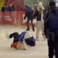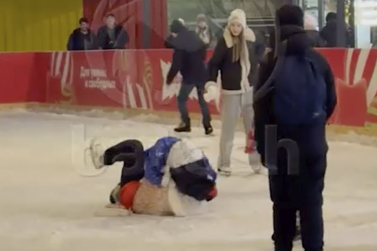 Дед Мороз пытался выгнать иностранного коллегу с катка, а затем повалил его на лед. Потасовка закончилась победой российского волшебника, он подал руку Санта Клаусу и помог ему подняться.