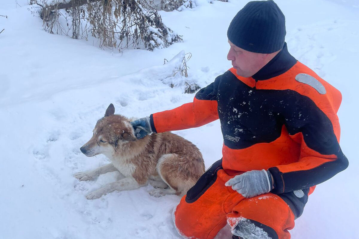 В экстренные службы обратились местные жители, которые заметили на реке собаку, барахтающуюся в полынье. Пес вышел на кромку льда, который не выдержал его веса и проломился.