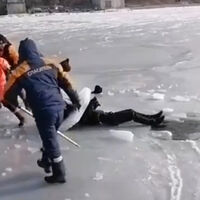 На кадрах с места инцидента заметно, как несколько сотрудников МЧС тянут рыбака за веревку, в тот момент как еще один вырезает часть льда, чтобы извлечь мужчину.