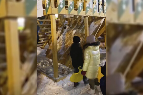 Ребенка госпитализировали после обрушения горки на площади 400-летия в Тюмени. Видео с места происшествия опубликовал Telegram-канал «Тюмень с огоньком».