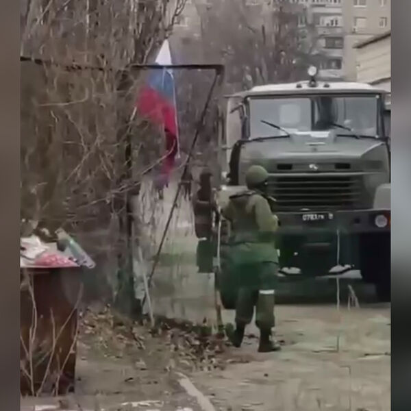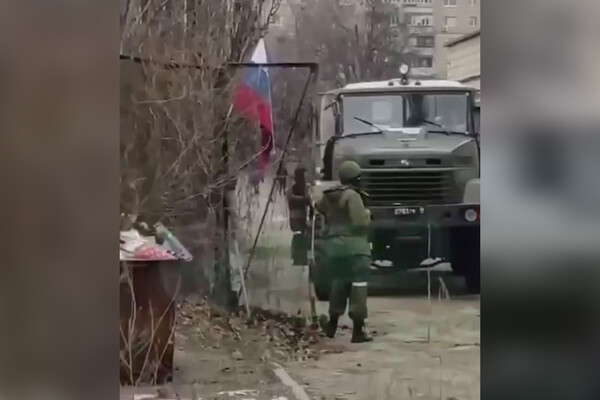 Материал дополнен видеозаписью, на которой запечатлены военный грузовик и несколько стоящих вокруг него людей в форме. Рядом с машиной установлен флаг РФ. При этом никаких камер, которые свидетельствовали бы о съемках фильма, на кадрах не видно.