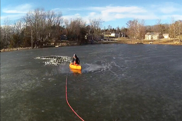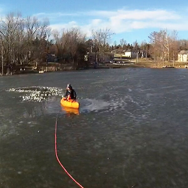 В Миссури полиция и служба спасения животных пришли на помощь женщине, которая застряла в каяке после спасения собаки, провалившейся под лед на замерзшем озере.