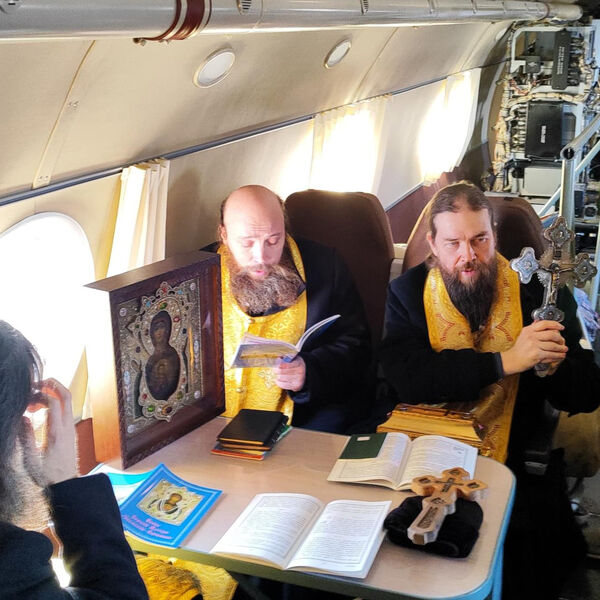 На борту самолета находились святыни Богословского монастыря: чудотворная икона Божией Матери «Знамение», частицы мощей святителя Николая Чудотворца и великомученика Георгия Победоносца, а также частица Животворящего Креста Господня. Борт совершил облет города.