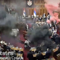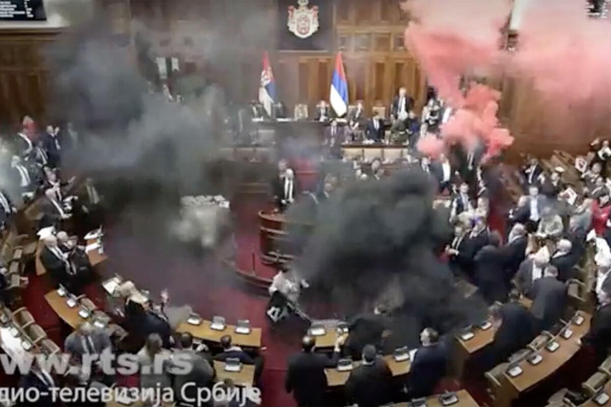 После утверждения повестки депутат от оппозиции Радомир Лазович направился в сторону президиума с выкриками в адрес руководства страны. Во время потасовки члены оппозиции зажгли файеры.