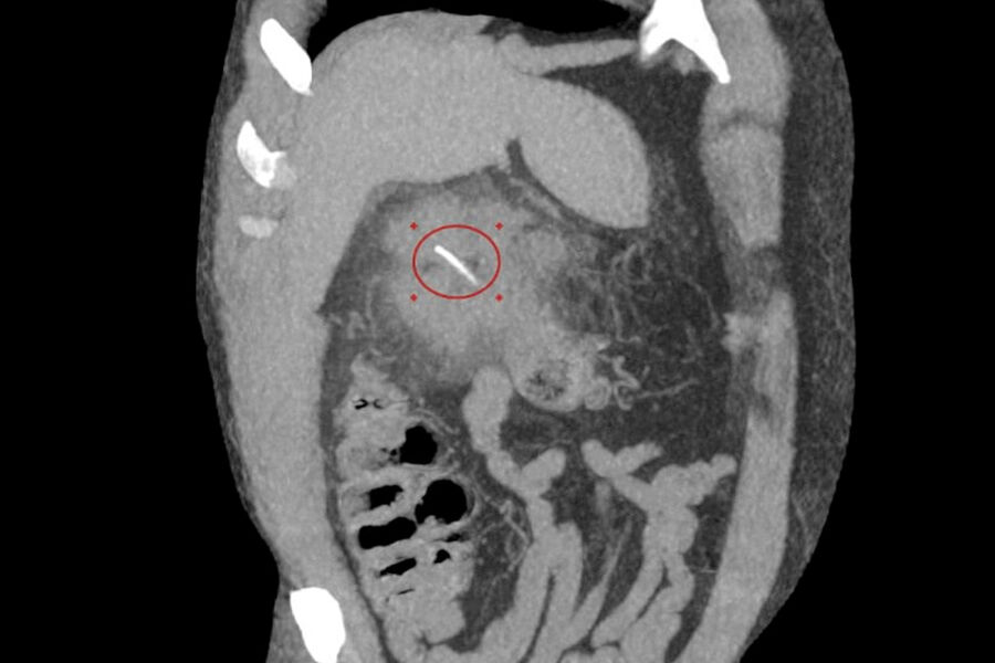 Пожилой пациент самостоятельно обратился с жалобами на периодические боли в правом подреберье. Мужчина рассказал, что увлекается рыбалкой, и месяц назад приготовил свой улов и съел. Во время трапезы, по его словам, он проглотил рыбью кость.