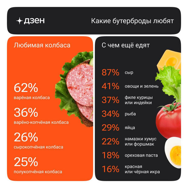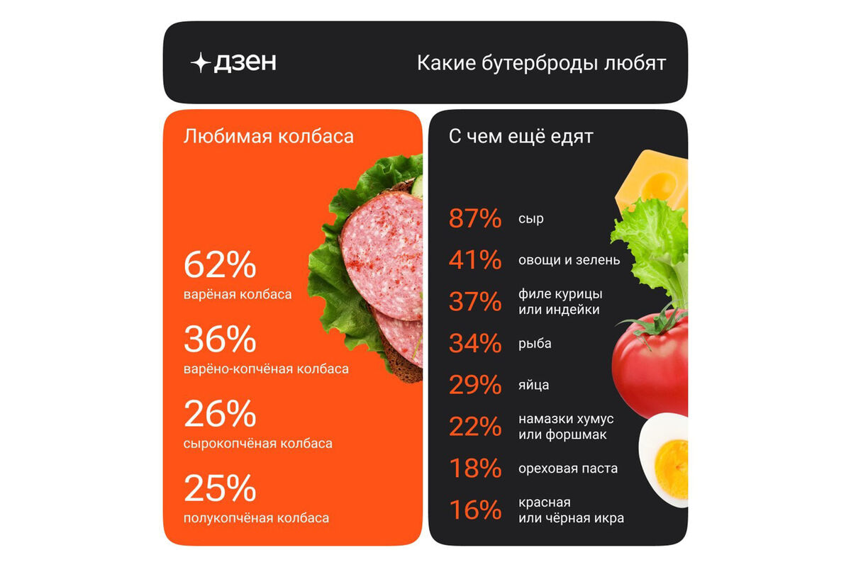 Главная альтернатива колбасы в бутерброде — сыр. Его едят с хлебом 87% опрошенных. На втором месте — овощи и зелень (41%), далее следуют филе курицы или индейки (37%) и рыба (34%). В топ ингредиентов на замену колбасы попали также яйца (29%), намазки вроде хумуса и форшмака (22%), а также ореховая паста (18%). Всего 16% опрошенных предпочитают колбасе красную или черную икру.