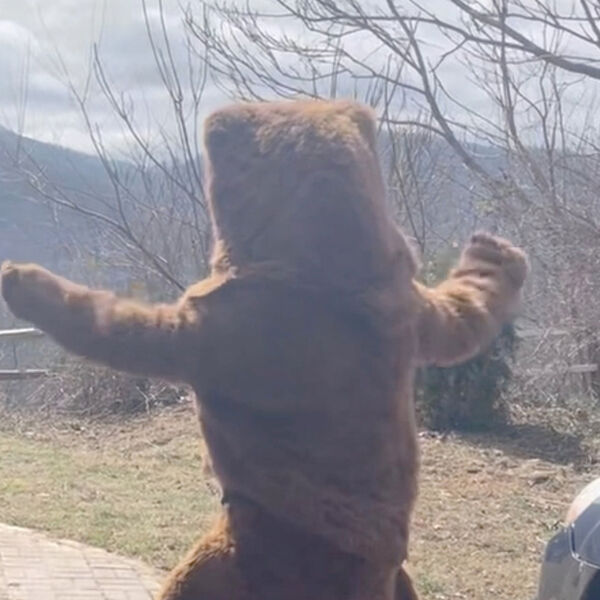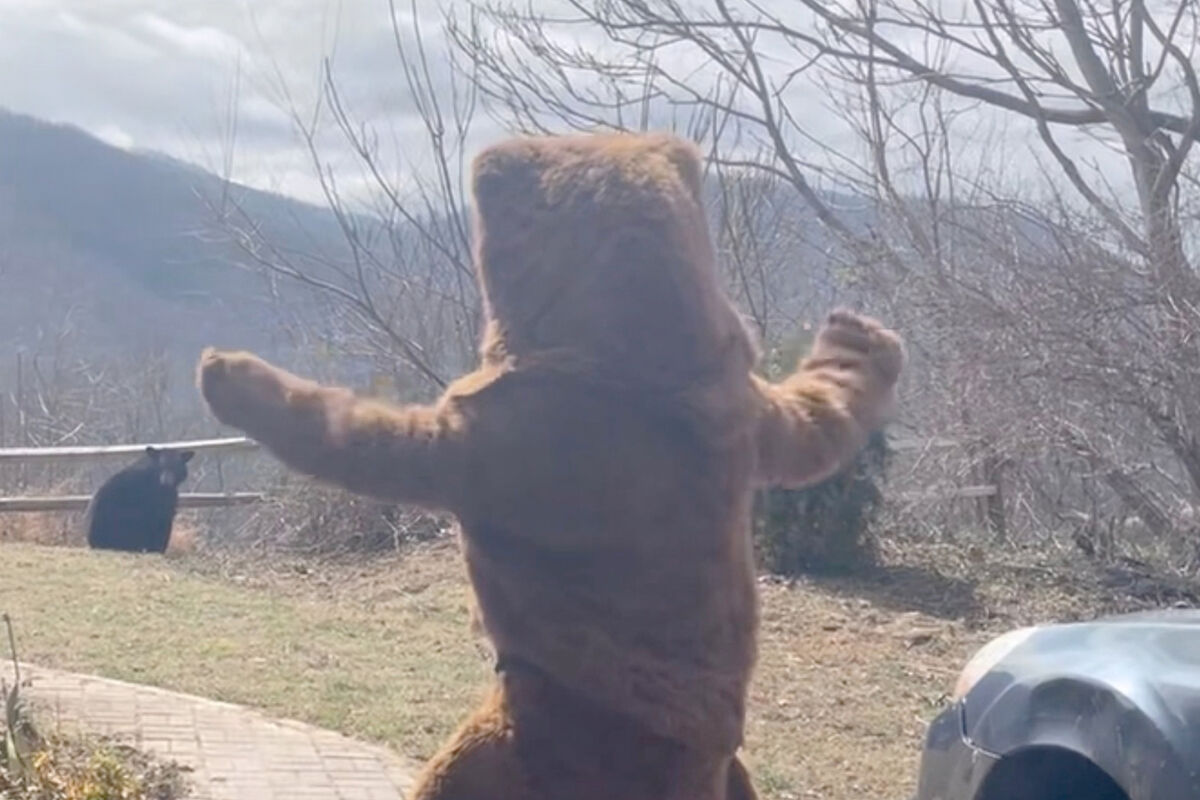 Американец переоделся в костюм мультяшного медведя и смело вышел на свой задний двор, чтобы встретить опасное животное. Отбросив осторожность, человек в костюме медленно надвигался на черного медведя и даже рычал на него.