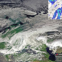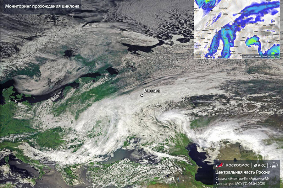 Российские спутники «Электро-Л» и «Арктика-М» сняли из космоса циклон «Зион», который принес в Москву снегопады и метели. Фотография опубликована в Telegram-канале «Роскосмоса».