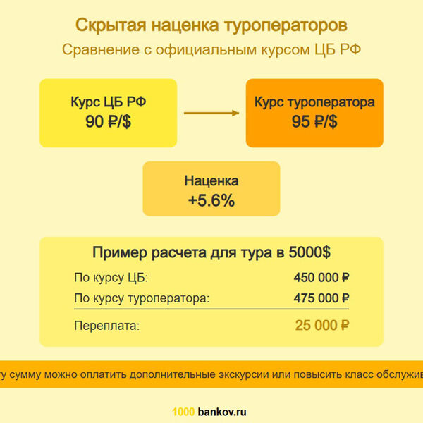 «Например, если официальный курс ЦБ РФ составляет 90 рублей за доллар, туроператор может использовать в расчетах курс 93–95 рублей. При стоимости тура в 1000 долларов разница составит от 3000 до 5000 рублей — сумма, которую большинство туристов просто не замечают в общей стоимости путевки», — отмечают эксперты.