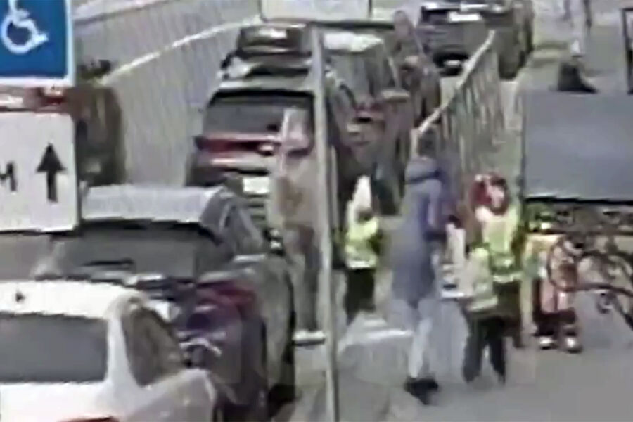 На кадрах с места инцидента заметно, как дети строем идут, предположительно, за воспитателем. В какой-то момент кирпич падает на мальчика. Педагогу удалось увернуться.