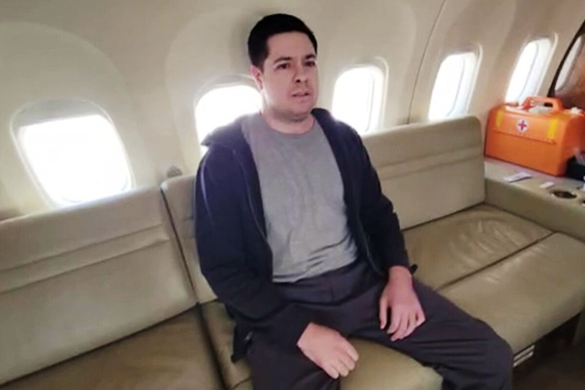На предоставленных службой кадрах россиянин находится в российском самолете после обмена. На видео также показано, как Петров спускается по трапу самолета, вернувшись в Россию.