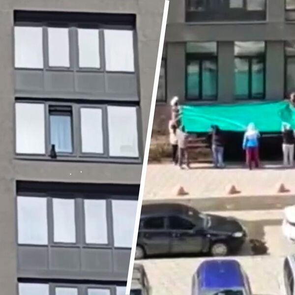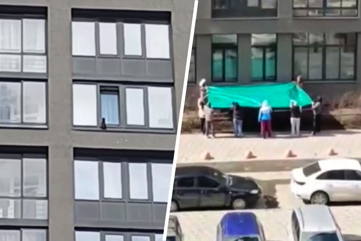 Перепуганное животное, сидящее на фасаде здания и пытающееся запрыгнуть в приоткрытое окно, заметили местные жители. Неравнодушные граждане собрались под окнами здания и растянули одеяло, готовые поймать кота, если он сорвется со стены.