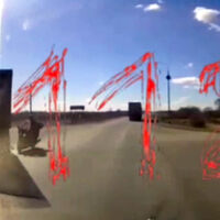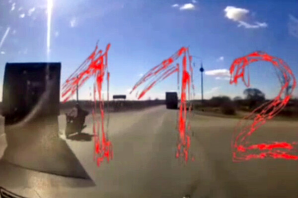 На кадрах с места инцидента заметно, как мотоцикл на скорости врезался в грузовик и сразу же разлетелся.