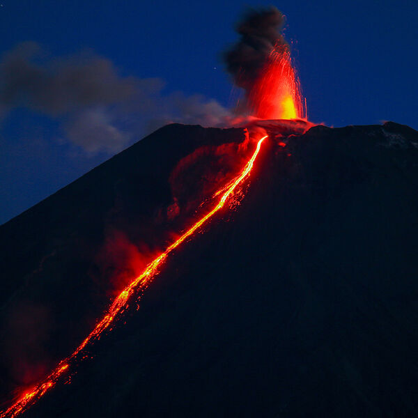 На ролике видно, как покрытая снегом верхушка кратера начинает светиться. Это связано с извержением стромболианского типа, то есть такого, при котором извержение является маломощным и продолжается непрерывно или с малыми интервалами вплоть до десятков тысяч лет, во время которых вулкан выбрасывает шлаковые конусы и шлейфы крученых вулканических бомб.