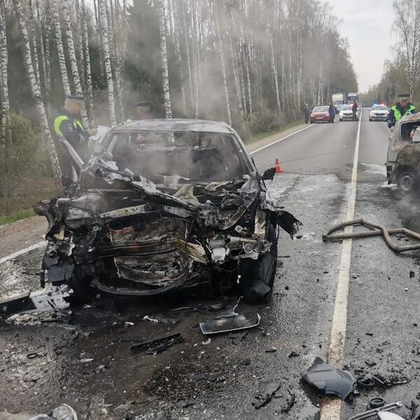 На кадрах с места аварии заметно, что оба транспортных средства полностью выгорели. У одного из автомобилей сильно деформирована передняя часть.