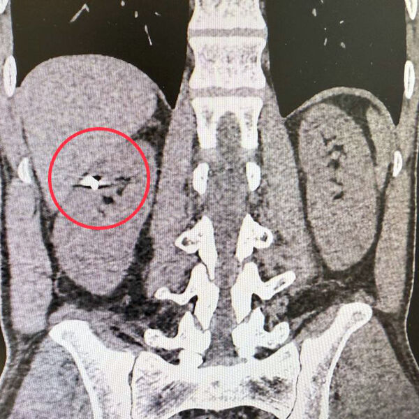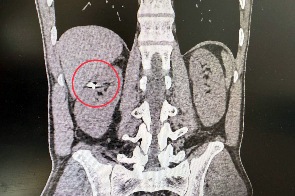 35-летний пациент получил травму около года назад, кусок металла размером 1 см прошел через печень и вонзился ему в почку. В ходе обследования медики обнаружили инородное тело в паренхиме – части органа, который фильтрует кровь. Было принято решение о проведении хирургического вмешательства.
