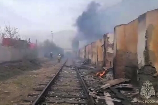 Уточняется, что на момент прибытия первых подразделений внутри складов было открытое горение. На месте работают 54 сотрудника ведомства и 17 единиц техники, в том числе пожарный поезд.