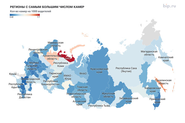 Чтобы определить, где за водителями наблюдает большее число дорожных камер, эксперты ранжировали регионы по «плотности» оснащения устройствами — количеству камер, которое приходится на тысячу водителей-пользователей bip.ru. Средний показатель по России в целом — 2,2, самые высокие значения по регионам: