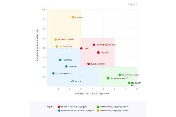 - Среднее количество камер и среднее количество штрафов: Ростовская область, Карелия, Татарстан и др.