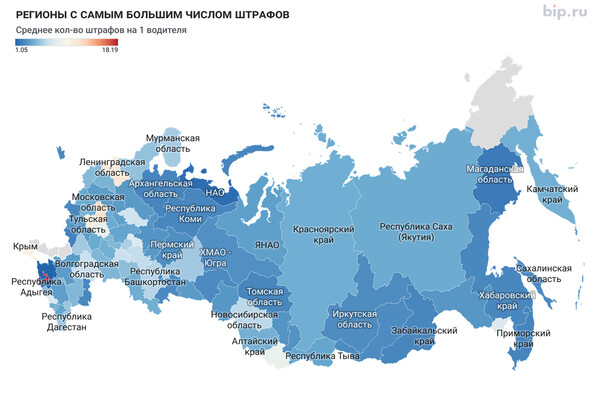 В каждом регионе аналитики соотнесли общее количество штрафов за год с общим числом водителей-пользователей bip.ru. При расчете учитывались только штрафы ГАИ, без постановлений МАДИ и АМПП. Средний показатель по России в целом — 5–6 постановлений на человека в год, самые высокие значения по регионам: