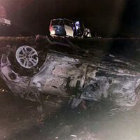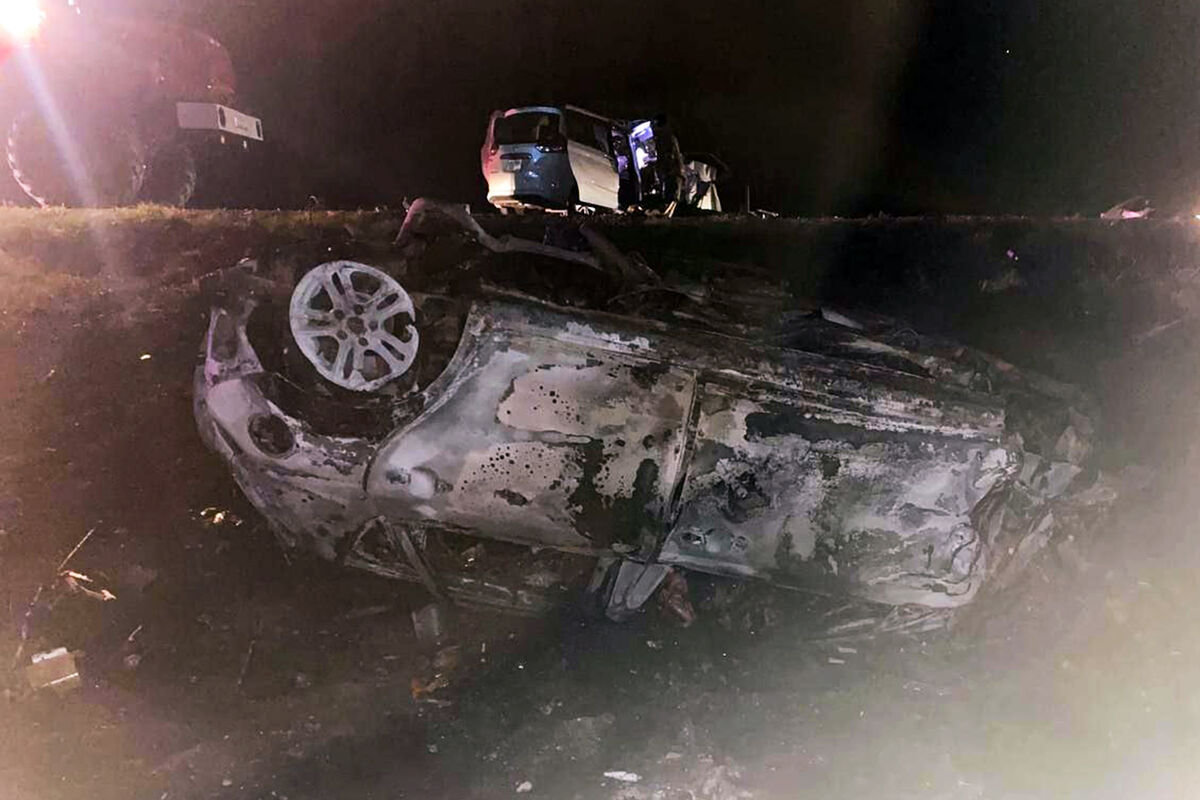 После этого второй участник движения врезался в Honda, съехал в кювет, опрокинулся и загорелся. На кадрах с места заметно, что заднюю часть машины смяло.